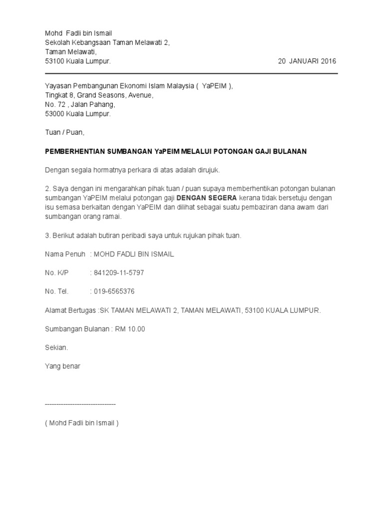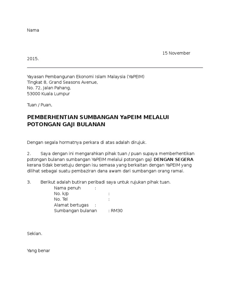 Cara untuk membatalkan sumbangan bulanan menerusi Skim Potongan Gaji YaPEIM boleh dilakukan dengan memahami maklumat yang disediakan oleh badan tersebut. Pekerja malindo air diberi notis cuti tanpa gaji selama dua minggu kerana covid 19. Contoh Surat Berhenti Potong Yapeim - Bagi anda yang bekerja di suatu perusahaan lembaga instansi pemerintahan dan menempati posisi personalia maka mungkin sudah tidak asing lagi dengan jenis surat yang satu ini.